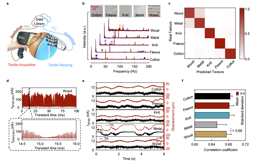 课题组利用制备的10×10神经形态触觉传感器阵列捕捉5种不同类型材质表面纹理的神经形态触觉信息(TA),见图3。不同类型材质的TA信号频谱存在不同的特征峰,其采用人工神经网络(ANN)计算的识别率高达93%,表明神经形态触觉传感器阵列可采集高质量材质表面特征信息。将这些触觉信息编码产生驱动执行器表面的触觉渲染信息(TR),尝试再现皮肤在虚拟空间重现材质表面“真实”的触觉。该传感器阵列采集的神经形态触觉信号(TA)与重现的触觉渲染信号(TR)相关性高达0.68;而在进一步的物理感知心理学实验中,超过75%的志愿者表示能够通过重现的触觉渲染信息可以感知物体表面的粗糙度,初步证明该触觉传感器具备实现触觉的采集-重现闭环功能的潜力。所提出的神经形态触觉传感器,凭借其低成本、低功耗、易于集成和制备等特点,为实现大规模人工触觉感知系统奠定了坚实的理论和实验基础。